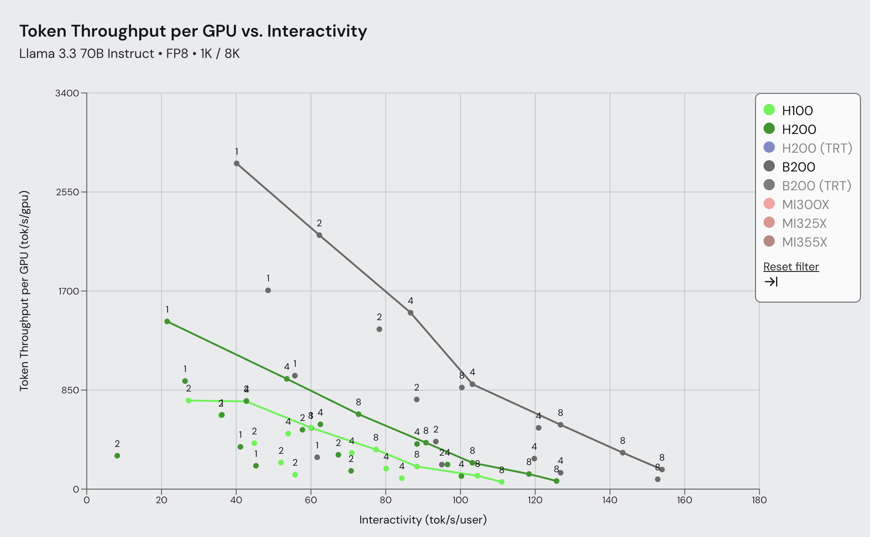 Figure 2: SemiAnalysis InferenceMax Llama 3.3 70B Pareto Frontier comparing vLLM Blackwell and Hopper performance for 1k/8k ISL/OSL across a wide range of interactivity. Results show up to 3.7x more throughput using vLLM on Blackwell vs. Hopper.
